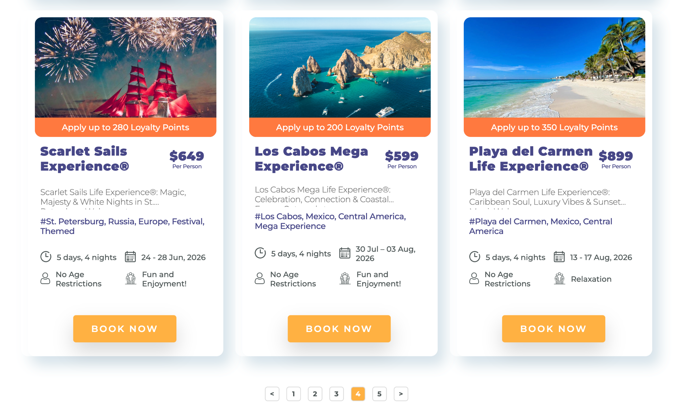 Every month 5 new Life Experiences are added and available to members. Apply Loyalty Points for each trip, or save up and after 12 months use 100% of your points towards a Life Experience.